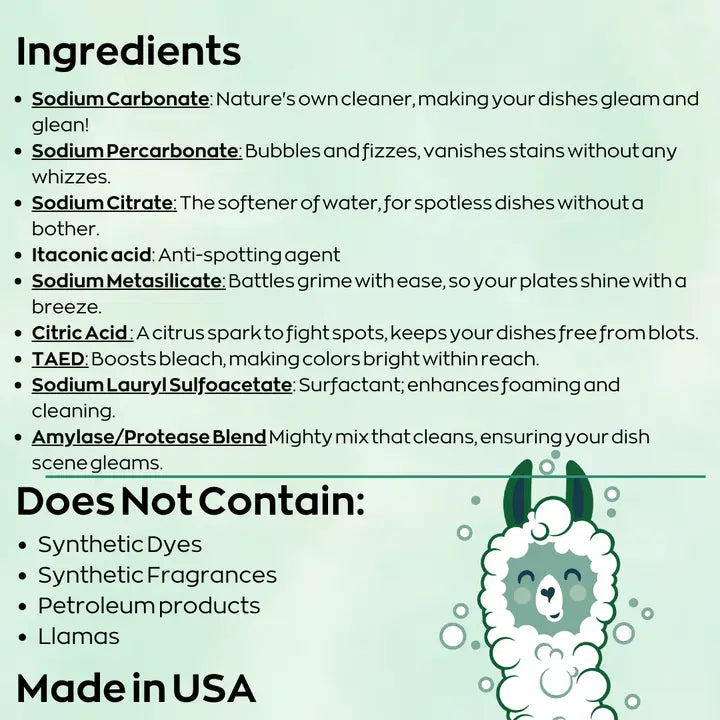 Our clean, effective formula is a superior alternative to conventional pods and detergents that rely on plastic film, artificial additives, or harsh synthetics. Unlike traditional dishwasher pods, Green Llama tablets are PVA-free, biodegradable, and safe for homes with sensitive skin, kids, or pets. Providing Safe and Powerful Cleaning
