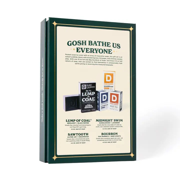 Packed cover-to-cover with an array of masculine soaps, this holiday gift set is an instant yuletide classic that is equally at home nestled on a mahogany bookshelf or in your medicine cabinet. With one 10 oz. full-size Big Ass Brick of Soap® and three 4.5 oz. half rations of soap, one is certain to find themselves in high spirits giving or receiving this treasured keepsake that scholars, families, and chimney sweeps of all ages will no doubt be celebrating for centuries.