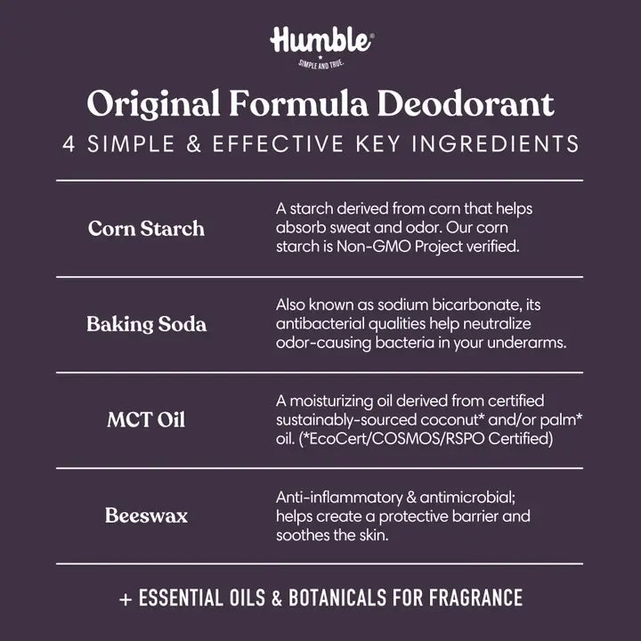 Product Description: Made with simple, highly effective ingredients (MCT oil, non-GMO corn starch, beeswax, baking soda and botanically-based scents). Humble Brands Deodorant is formulated to absorb and neutralize body odor and has no aluminum, alcohol, dyes, parabens, sulfates or artificial fragrance. From the paperboard packaging to the ink and lining, Humble’s plastic-free deodorant will biodegrade in 2-5 months and is recyclable. Certified Cruelty-Free by Leaping Bunny and a 1% for the Planet product that gives back with every purchase.