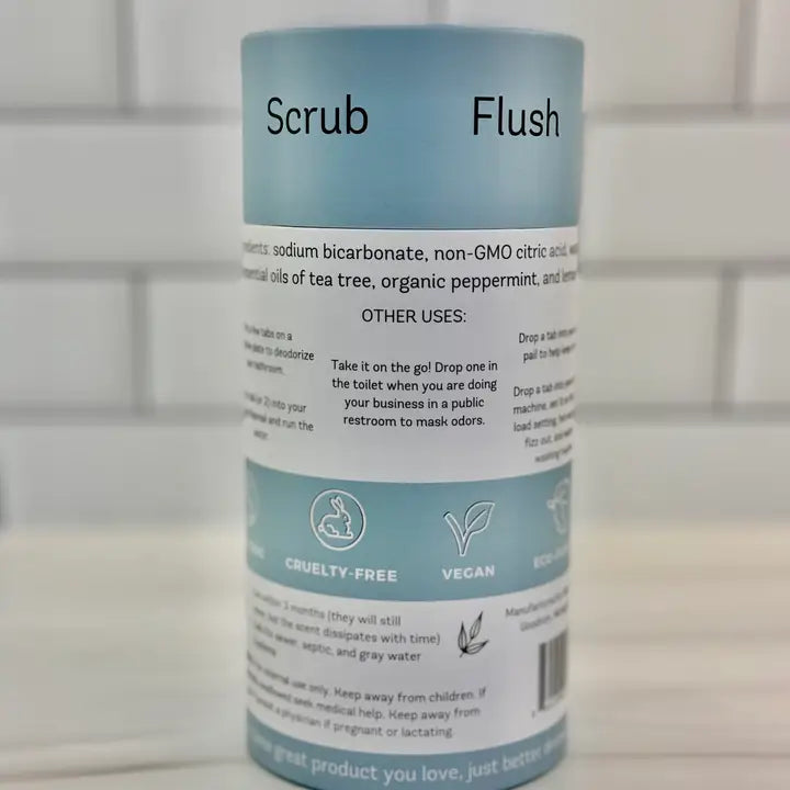 • ingredients: sodium bicarbonate, non-GMO citric acid, water, essential oils of organic peppermint, tea tree + lemon. plastic-free packaging